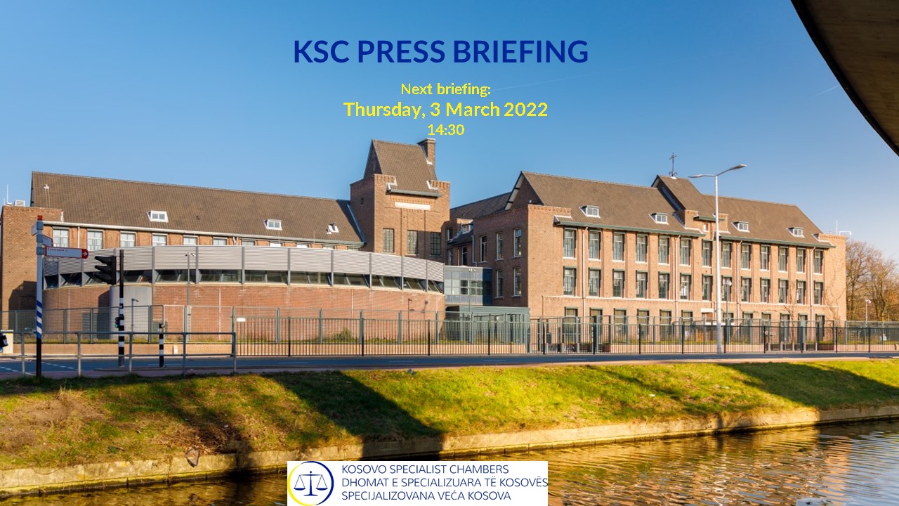 Another KSC weekly press briefing will take place on Thursday, 3 March, at 14:30. During this briefing, the KSC Spokespersons will provide a short update on the latest developments in the judicial proceedings before the KSC, as well as on other public activities of the Court. Journalists will have the opportunity to ask questions. Pre-registration is required to attend each briefing. To pre-register, please send an email with name and affiliation to [email protected]. Deadline for pre-registration is every Thursday at 12:00. The Zoom details will be shared following pre-registration. Recordings of the update provided during the Weekly Press Briefings will be made available on the KSC YouTube Channel.